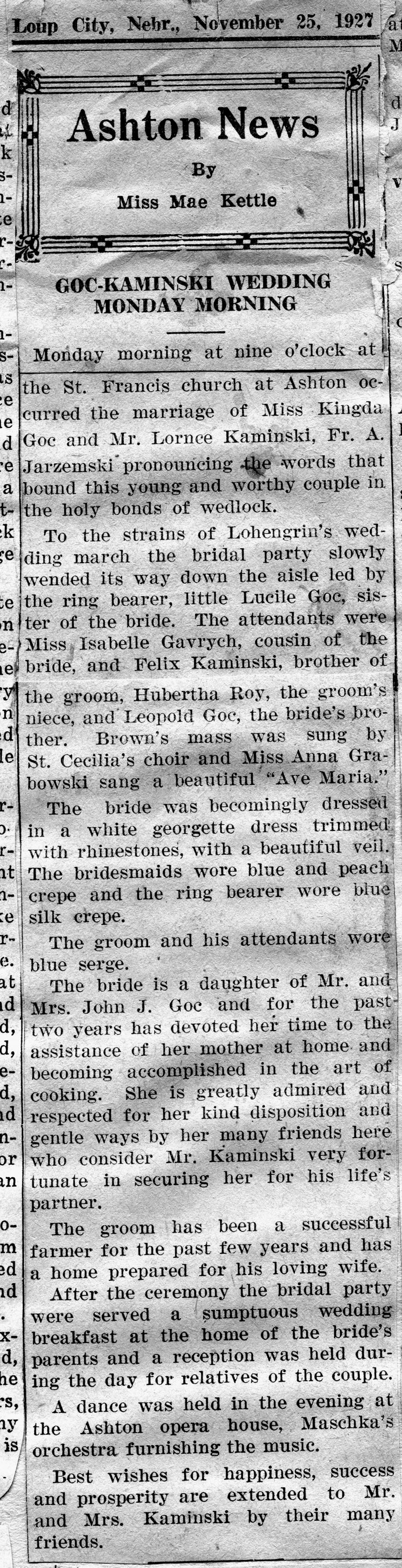 Wedding notice for Lawrence Kaminski and Kingda Goc