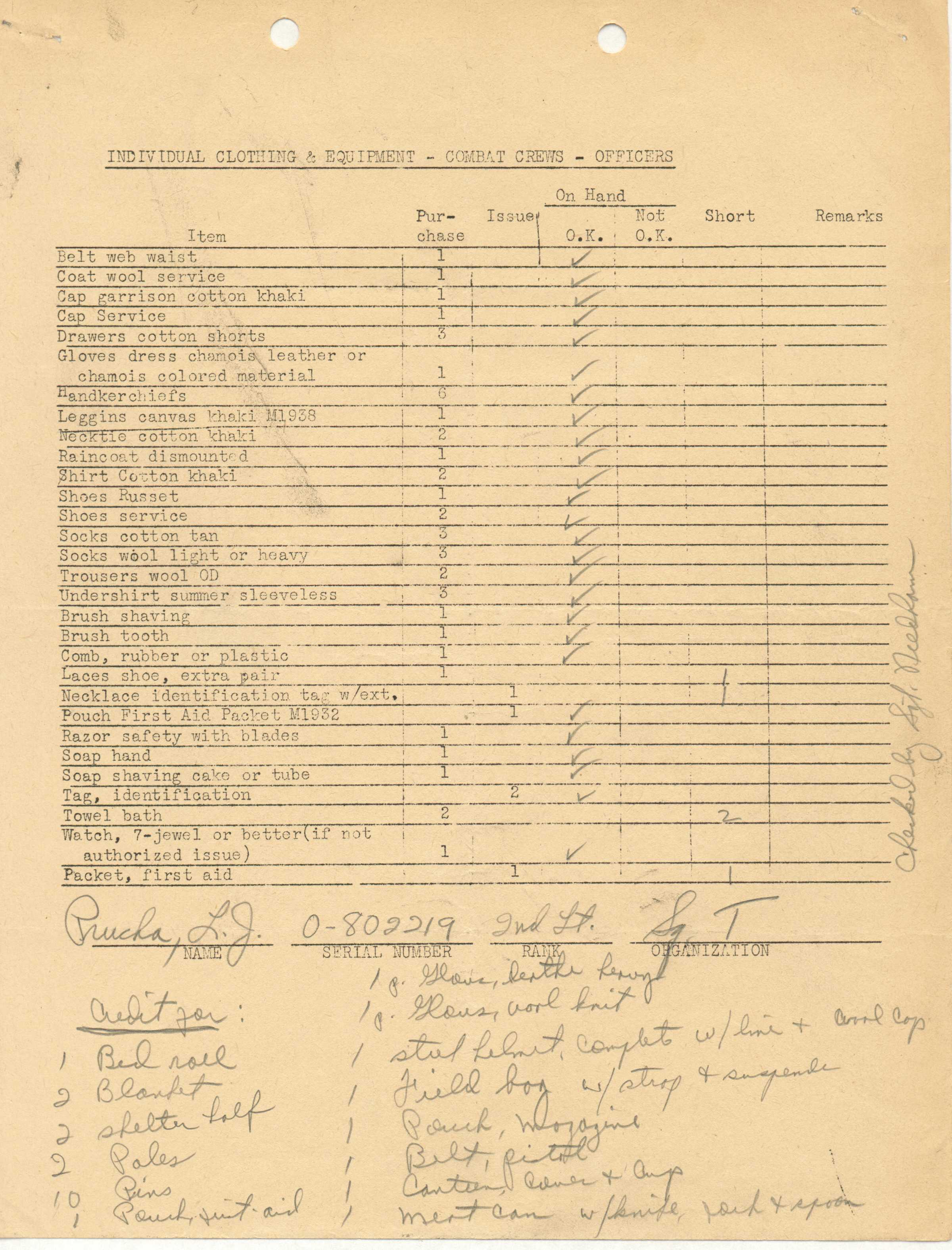Certificate that Lt L.J.Prucha has been instructed in Air Sea Rescue Equipment in the A-20 and B-25 type Airplane, attended 4 gunnery training films, and went through a ditching procedure drill on 20 Feb 44.