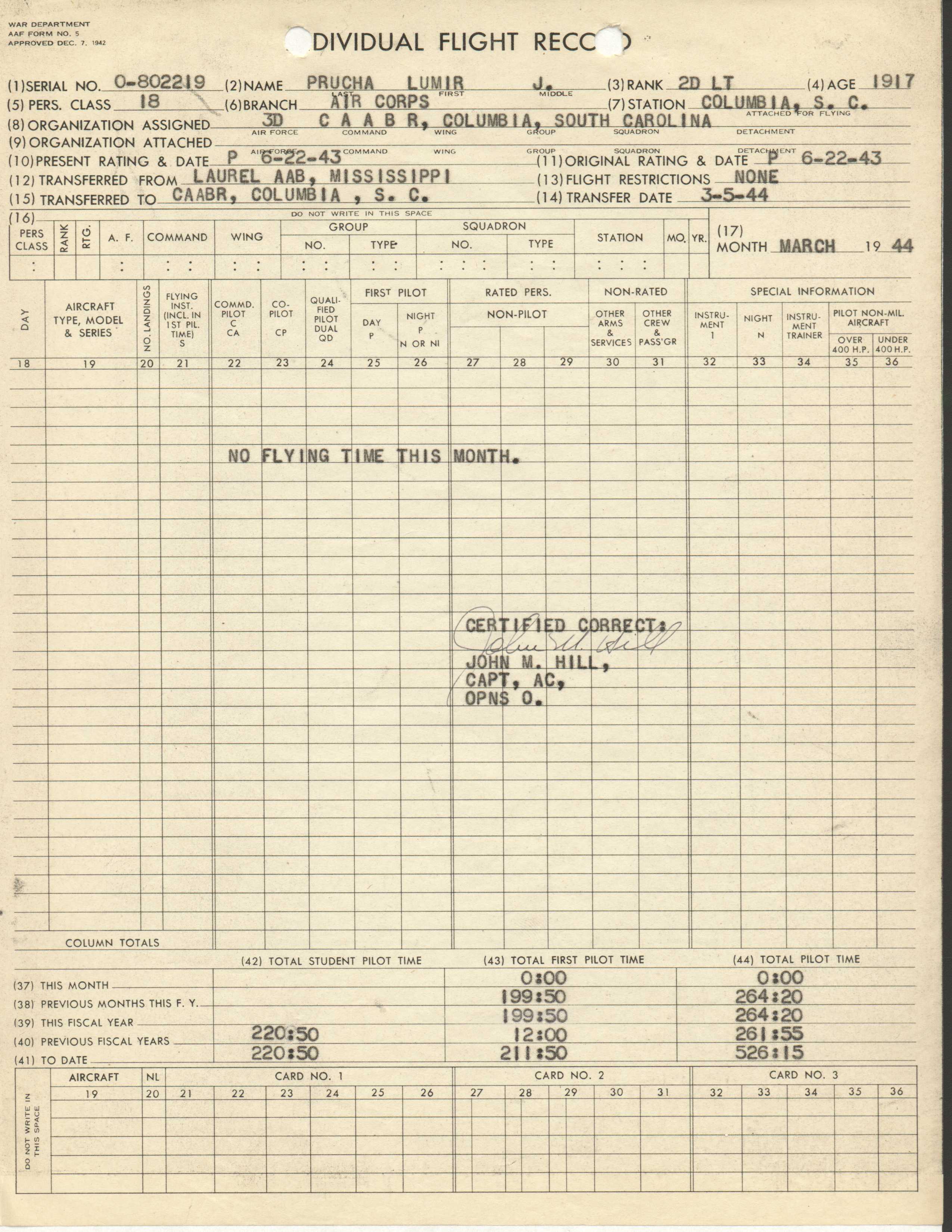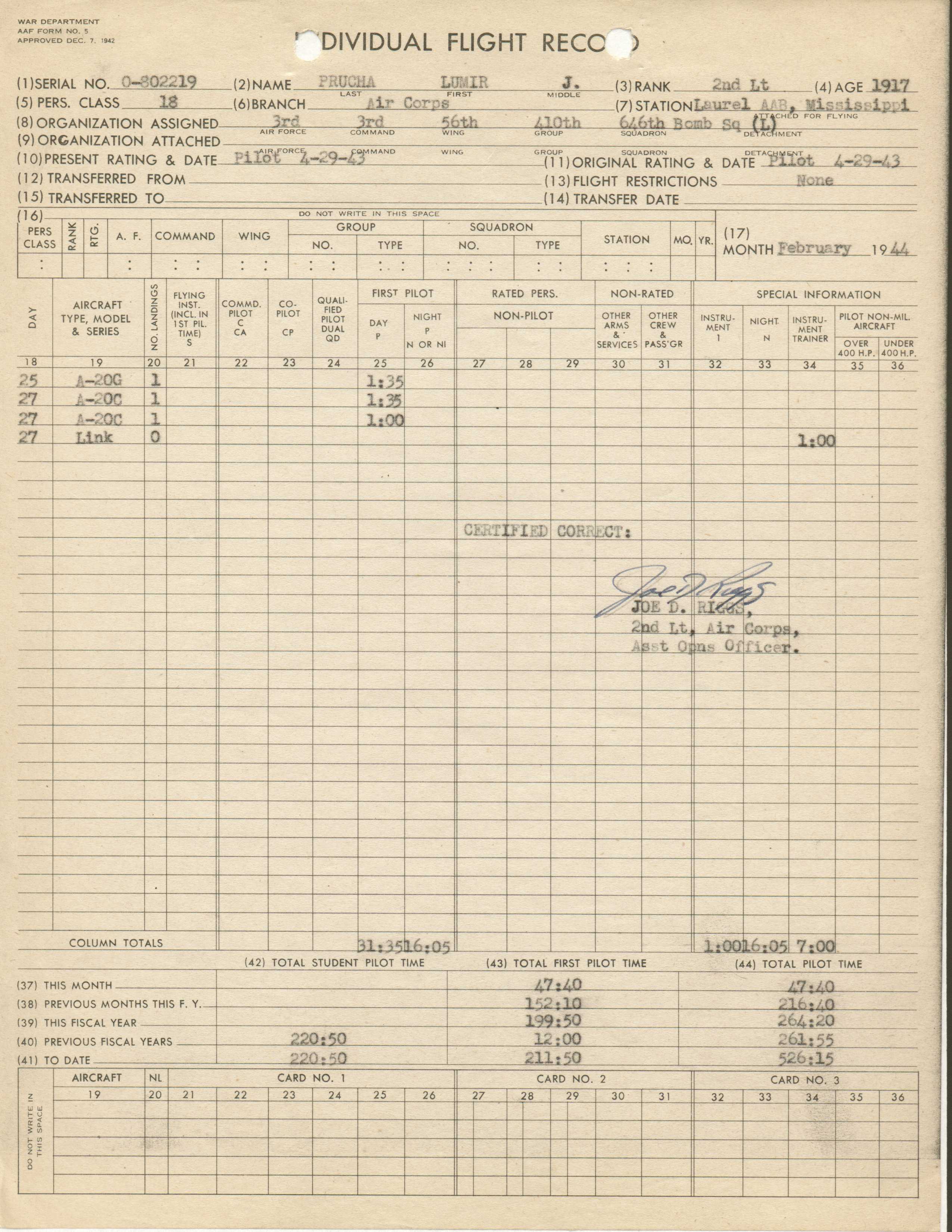 Pars. 1 - 6. Par. 2 - Named officers, 646 Bomb Sq (L), 410 Bomb Gp (L), are qualified as Limited Pilots in listed Aircrafts. 2nd Lt Lumir J. Prucha named on A-20A, A-20C, A-20G, B-25C & D and RDB-7B aircrafts. (Page 4 of 5)