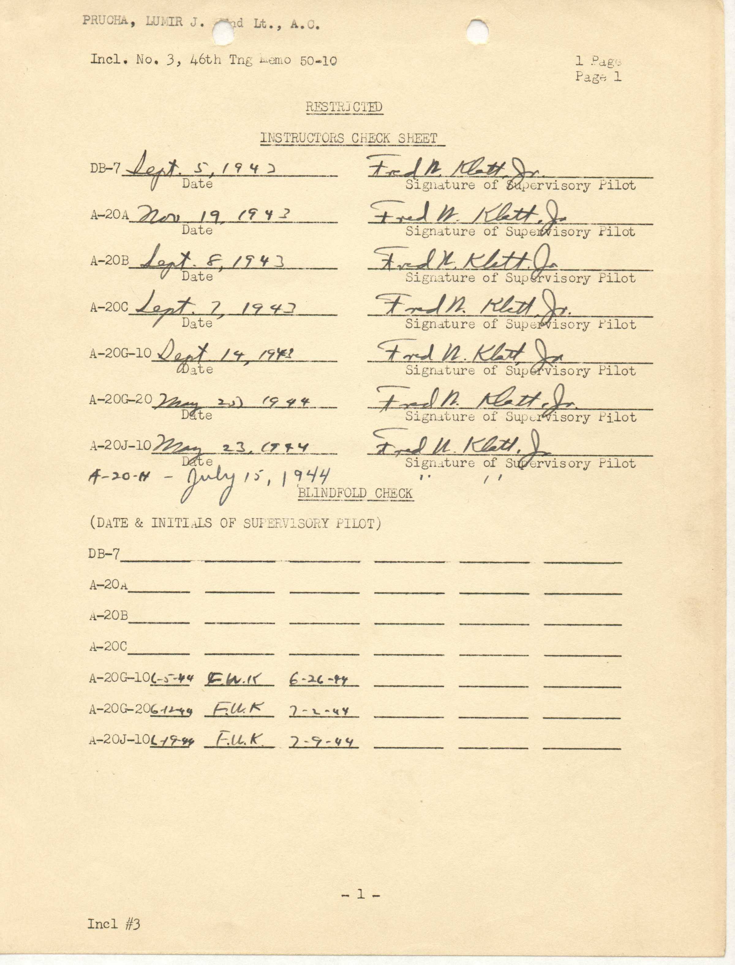Certificate that 2nd Lt. Prucha, L.J. has taken blindfold cockpit check in the A-20 type Airplane on Nov 5, 1943 and Nov 12, 1943.