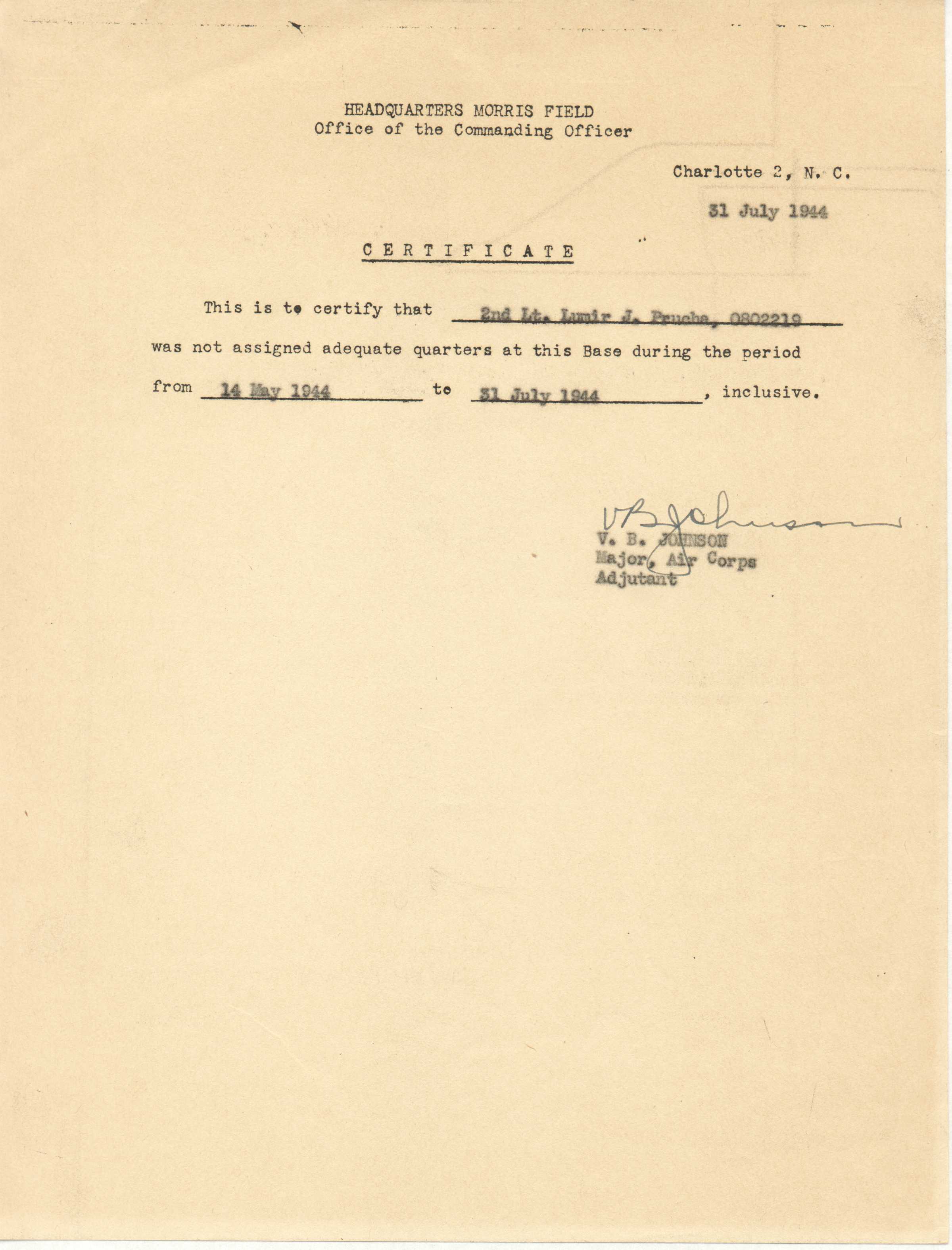 Certificate of Clearance and Termination or Non Assignment of Quarters. Lumir J. Prucha, 2nd Lt. Was on duty at this station from 4 Oct 43 to 9 Jan 44.