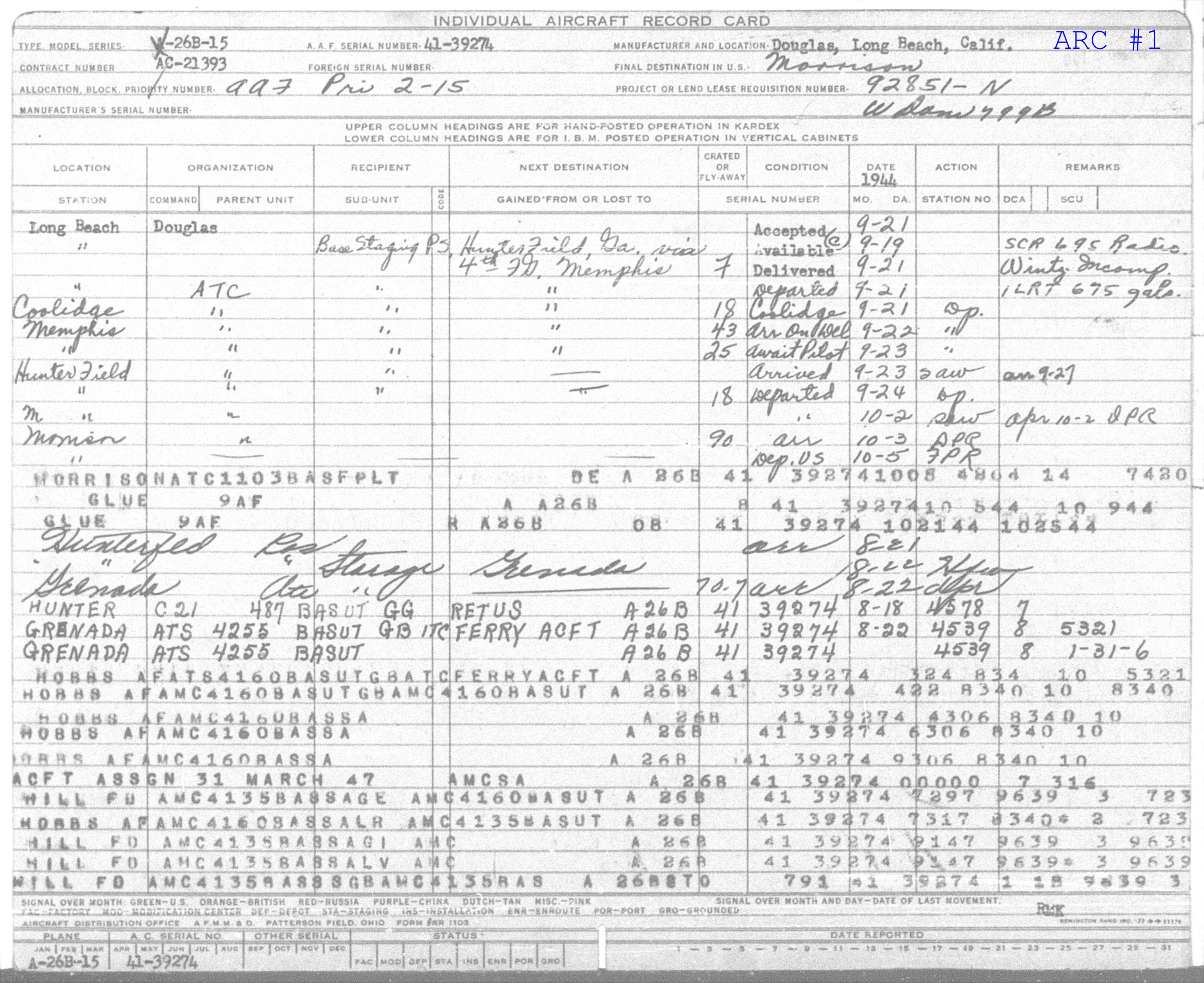 "HUNTER" = Hunter Field, GA [STATION]"C21" = Unknown [COMMAND] "487 BASUT" = 487th AAF Base Unit [PARENT UNIT] "GG" = Gained from outside continental US; not previously included in continental U.S. inventory [CODE] "RETUS" = Returned To U.S. [GAINED FROM AND LOST TO (Sub-Command)] "A26B" = A26B [A/C Type] "41 39274" = 41-39274 [SERIAL NUMBER] "8-18" = 18-Aug-1945 [MON and DAY] "4578" = Hunter Field, GA. Note "4578" should probably be "4378". [STATION NUMBER] "7" = Unknown [DCA] |