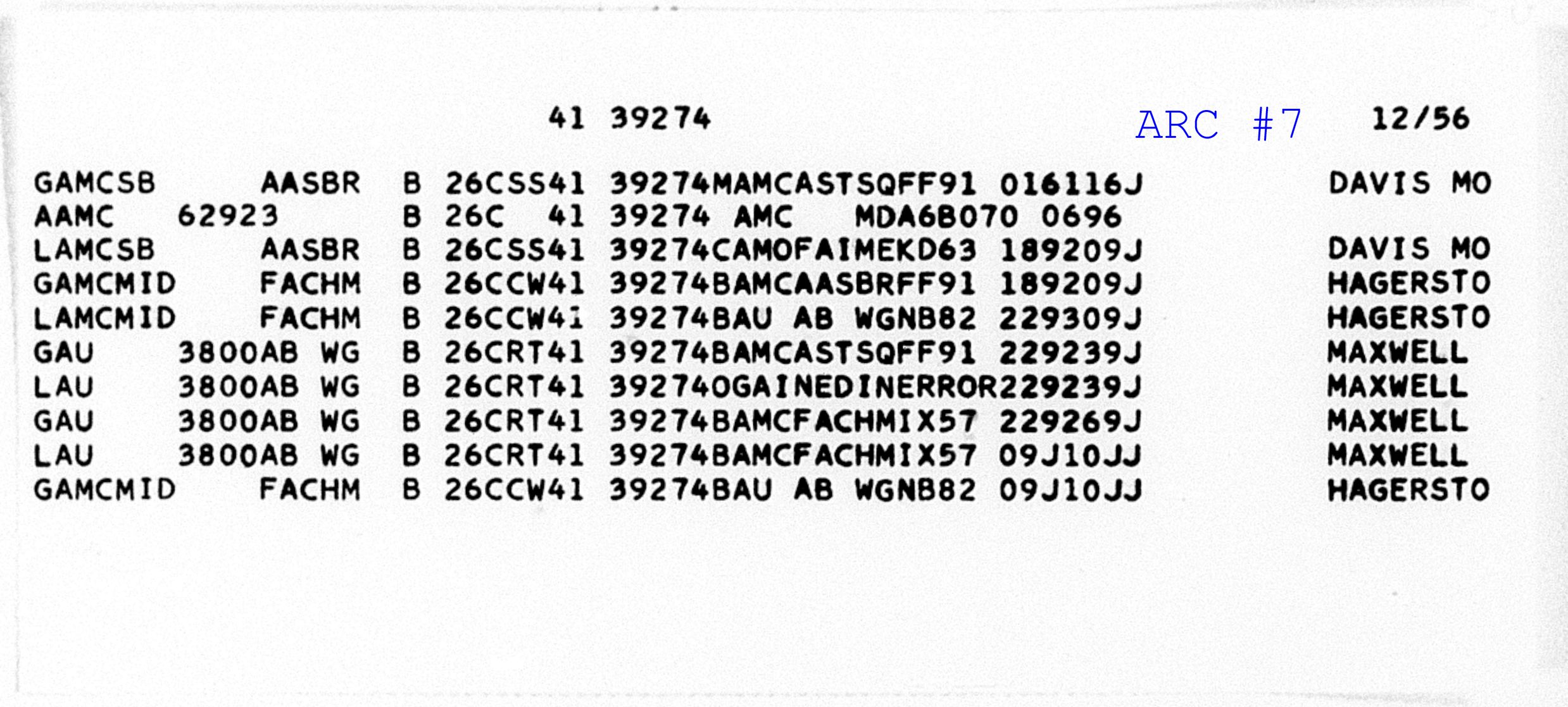 "ASSGN" = Hill Air Force Base, UT [REPORTING STATION]"AFE" = US Air Forces Europe [REPORTING UNIT (Command)] "AMC" = Air Materiel Command [GAINED FROM or LOST TO (Command)] "AFE00581" = Unknown [GAINED FROM or LOST TO (Sub-Command)] "B26C" = B26C [AIRCRAFT TYPE AND MODEL] "2" = Unknown [AMC AREA] "1806" = Unknown Station Number [REPORTING STATION NUMBER] "63052" = 30-Jun-1952 [DATE OF REPORT] "39274" = 41-39274 [NEXT IARC TO BE PRINTED] |
