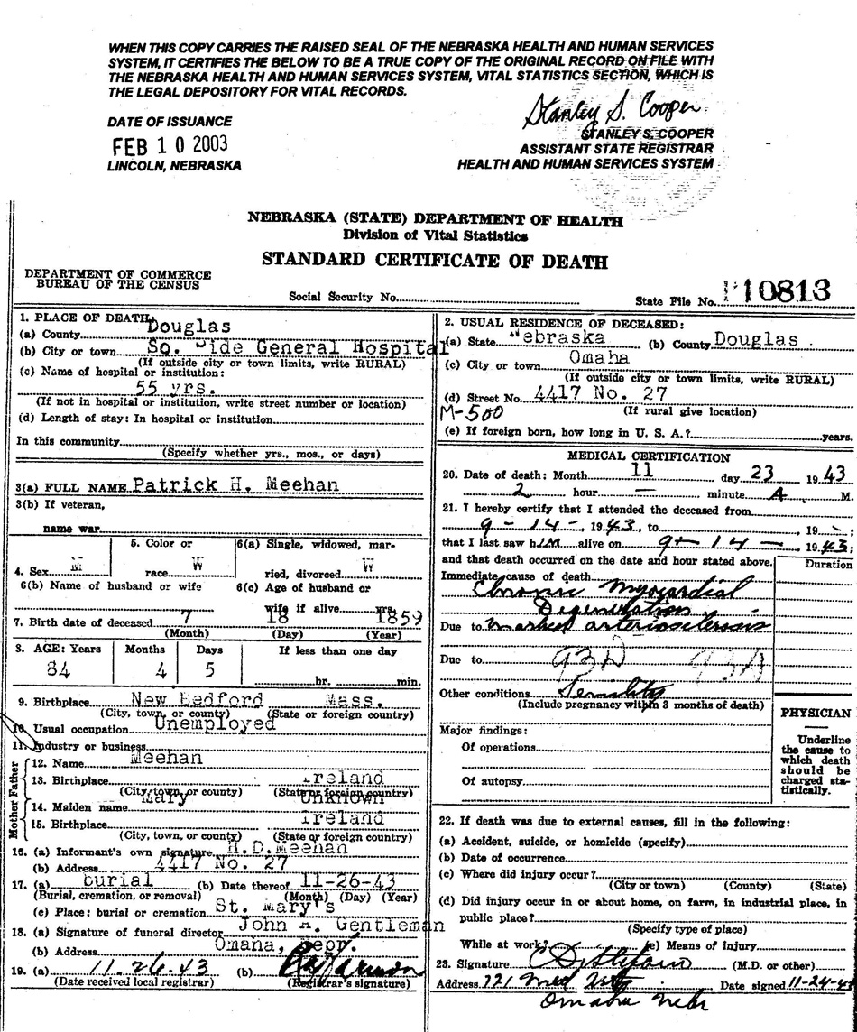 Meehan, Patrick Henry, Death Certificate, 23 Nov 1943