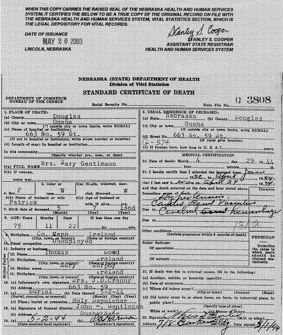 Gentleman, Mary A. (Dowd), Death Certificate, 29 Apr 1944