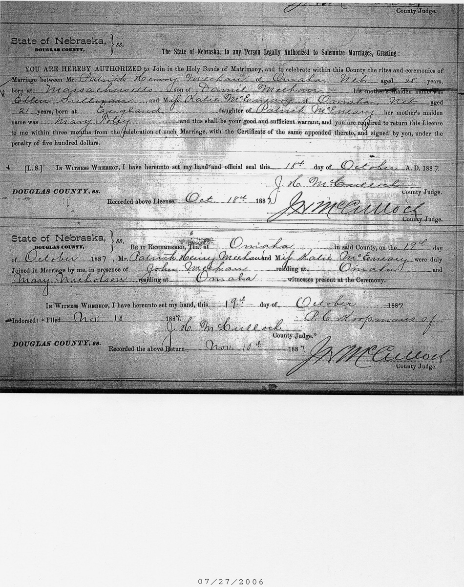 Meehan , Patrick Henry and Katie McEnery, Marriage Record, 19 Oct 1887