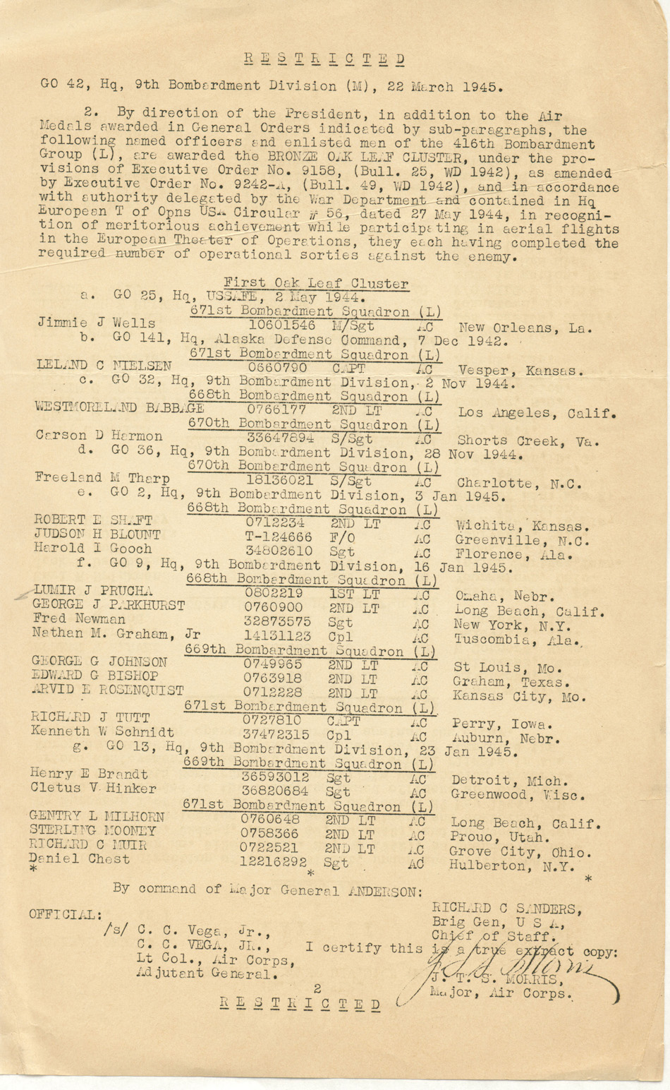 Prucha, Lumir Joseph, 1st and 2nd Bronze Oak Leaf Cluster Awards, 22 Mar 1945