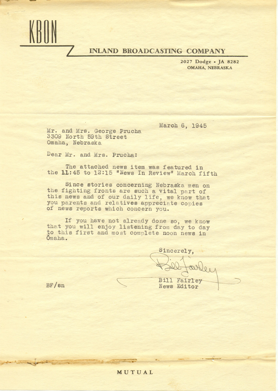 Prucha, Lumir Joseph, Air Medal Award Press Release Cover Letter, 6 Mar 1945