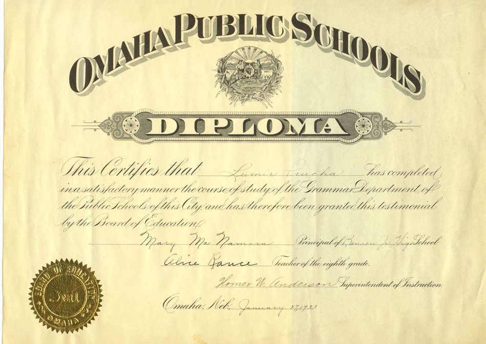 Prucha, Lumir Joseph, 8th Grade Diploma, 27 Jan 1933