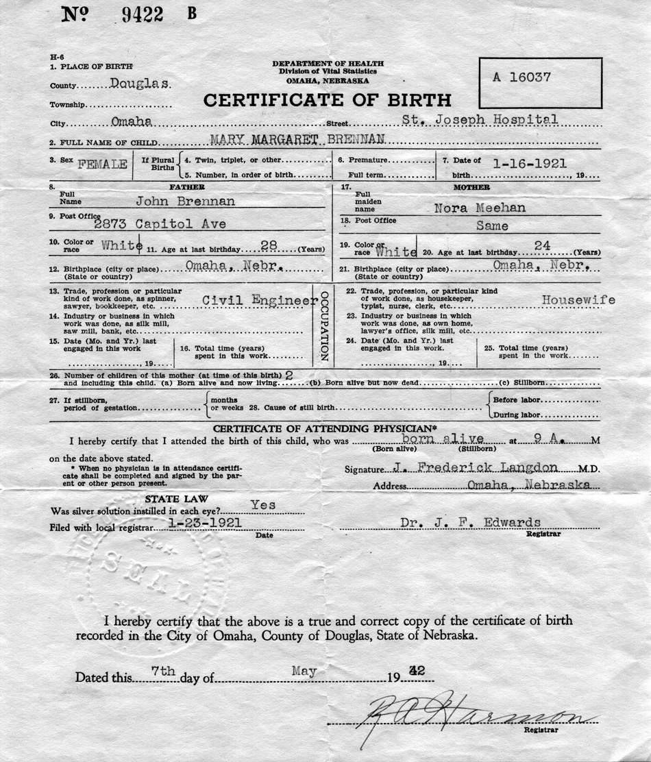 Brennan, Mary Margaret, Birth Certificate, 16 Jan 1921