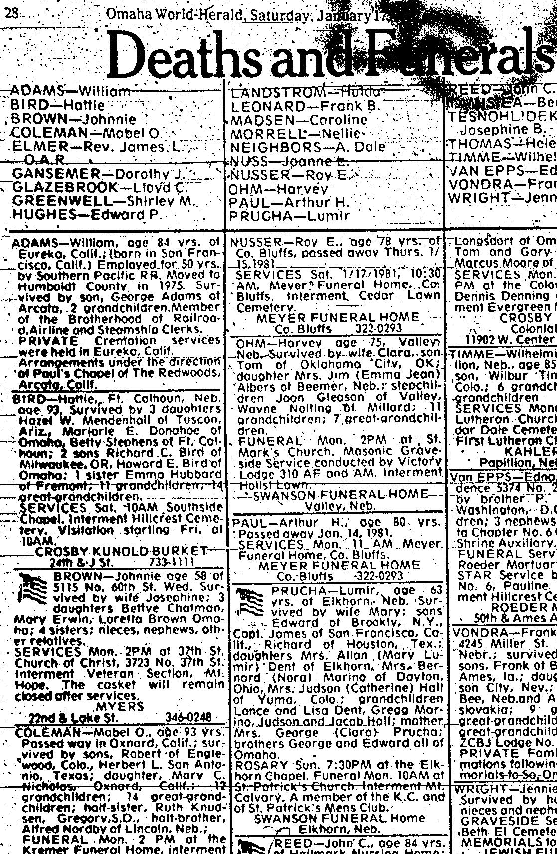 Prucha, Lumir Joseph, Obituary, 22 Jan 1981