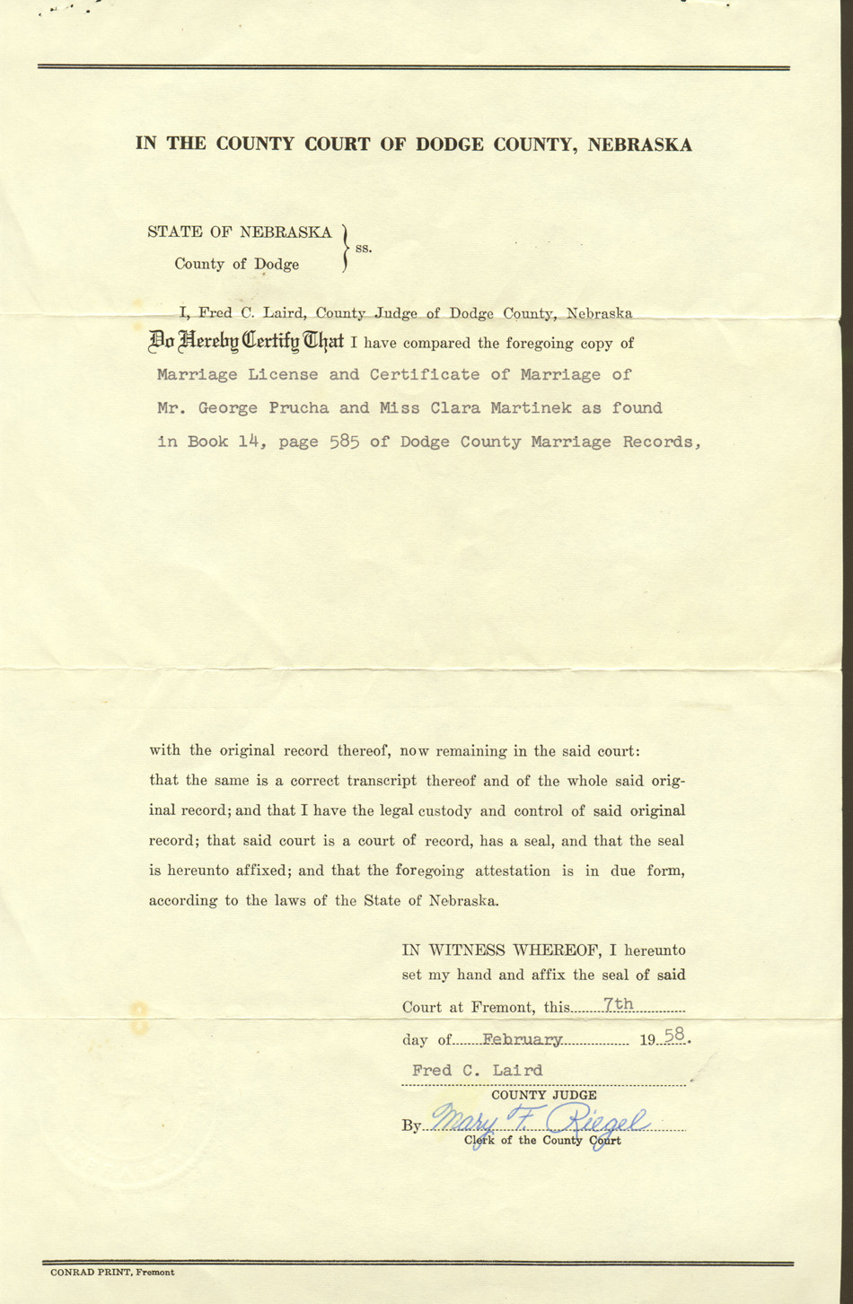 Prucha, George and Clara Martinek, Marriage Certificate, 17 Nov 1914