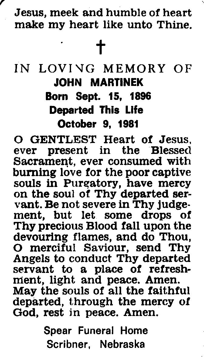Martinek, John, Jr., Prayer Card, 9 Oct 1981